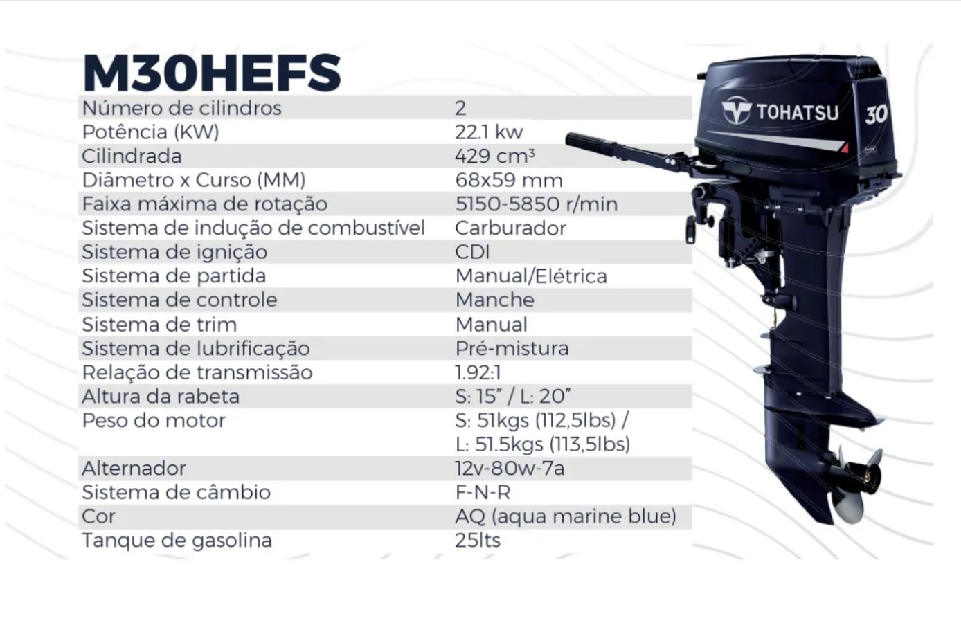 - 01 Motor de Popa Tohatsu 30HP 2 Tempos M30HS com hélice